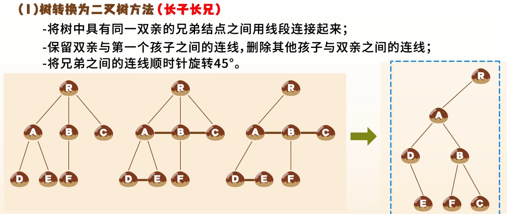 - 后面各树的根作为前一棵树根的“右兄弟”(即挂在右子树链上)