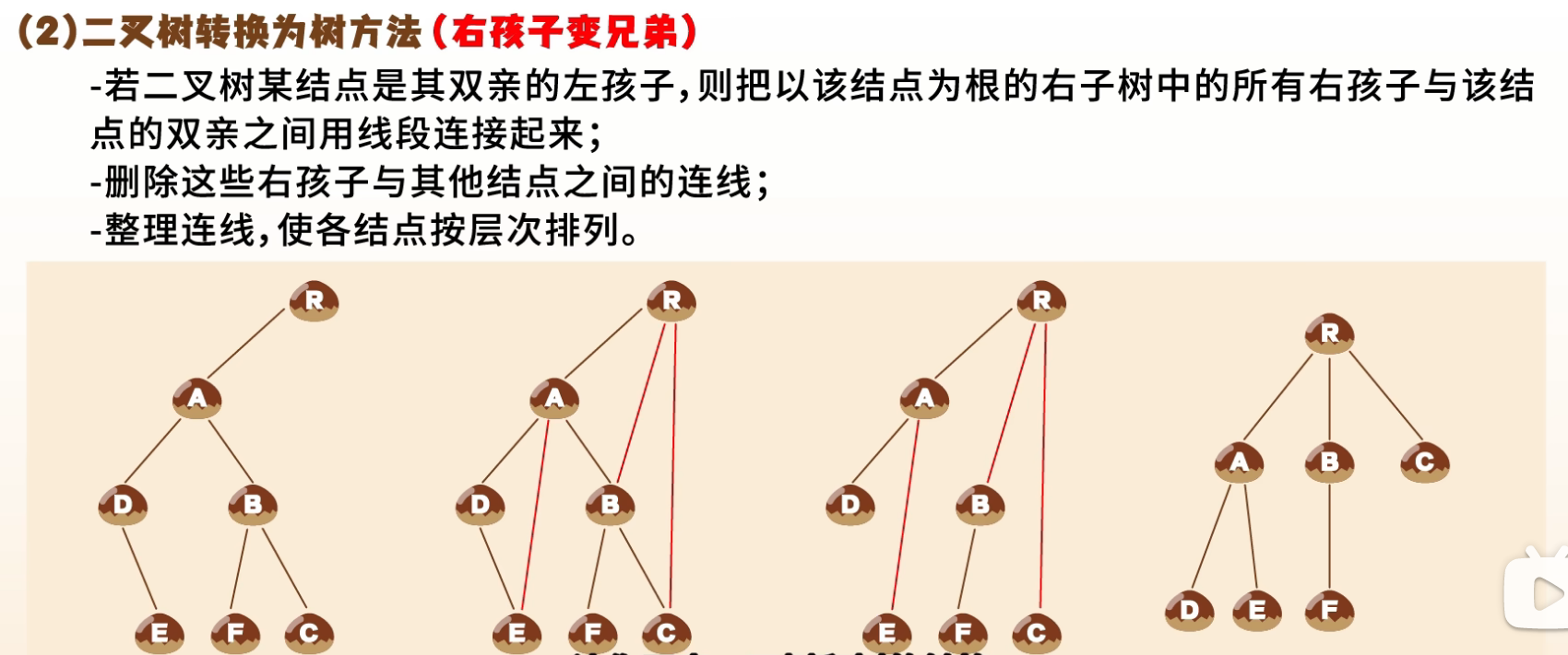 - 逆过程:右孩子视为兄弟,左孩子视为孩子