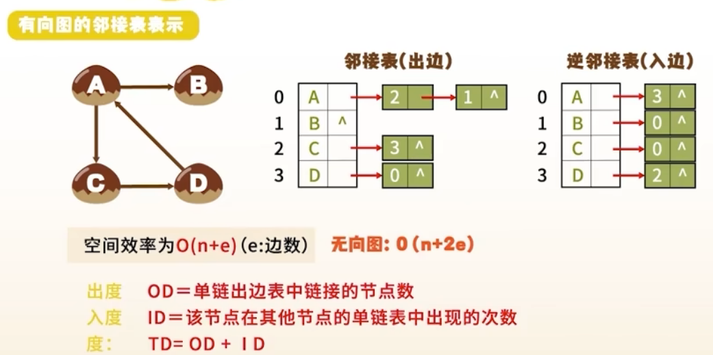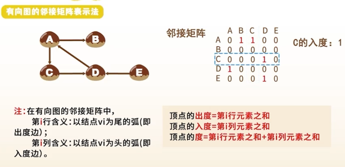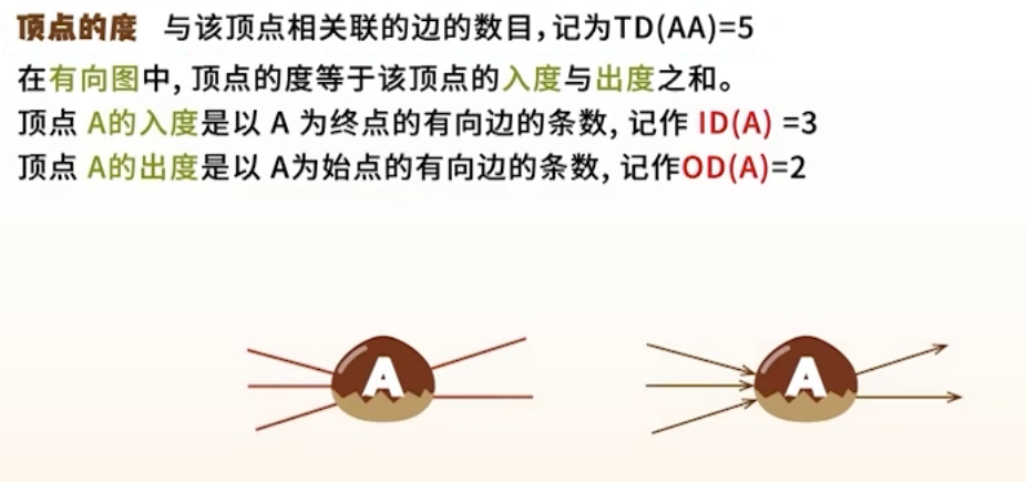 无向图:一个顶点的边数;有向图:入度(指向该点) + 出度(从该点指出)