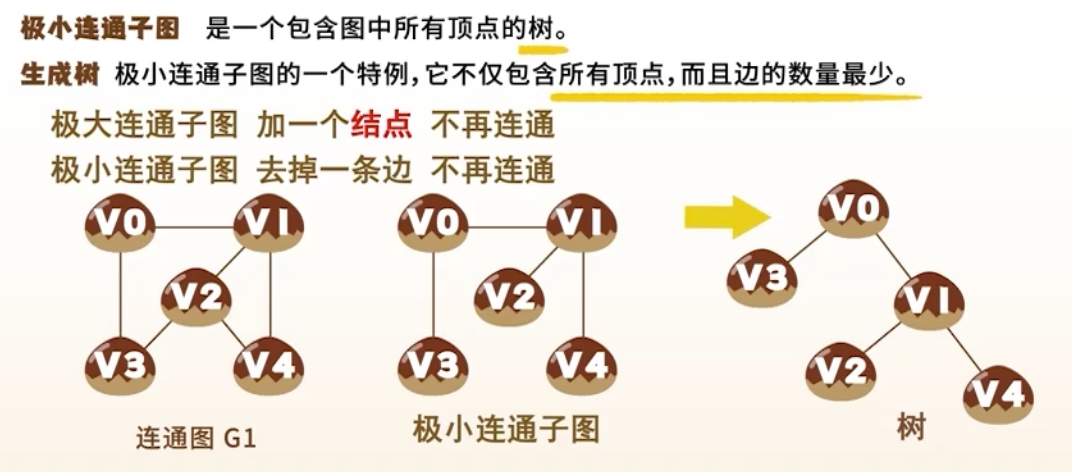 - 生成树:连通图的极小连通子图,含所有顶点, 条边\
