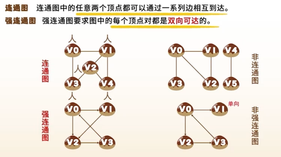- 连通图(无向图中任意两点可达);强连通图(有向图中任意两点互相可达)