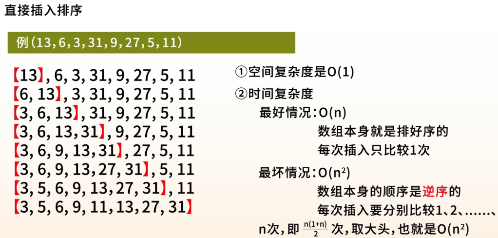 - 将每个元素插入到已排序部分的正确位置