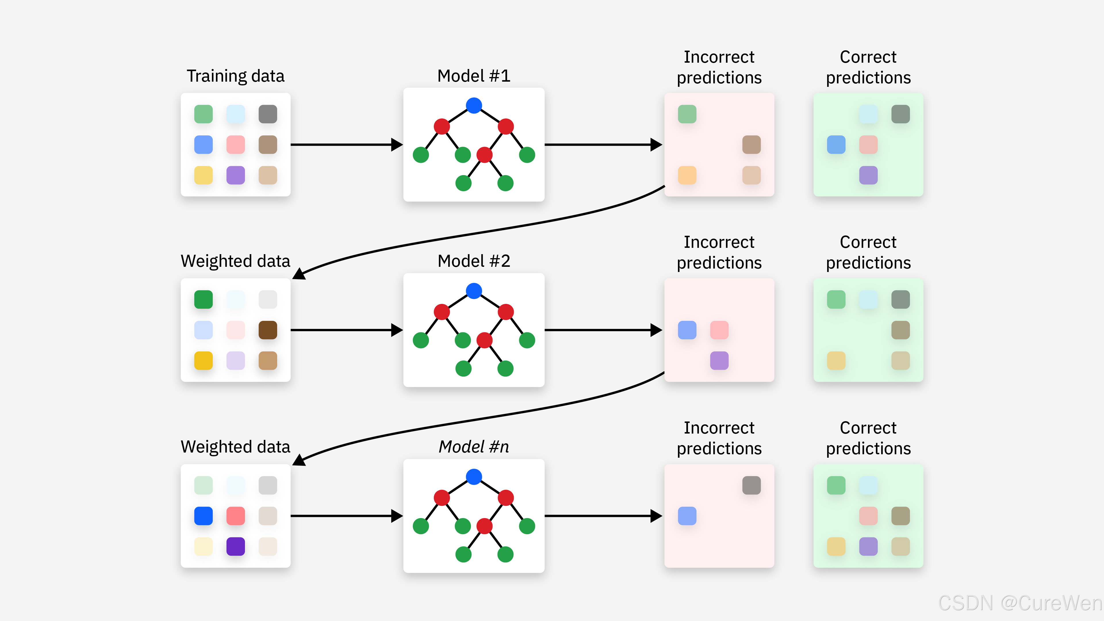 - 原理:迭代训练弱学习器,逐步增加前序模型误分类样本的权重,降低正确分类样本的权重,最终通过加权投票整合结果。