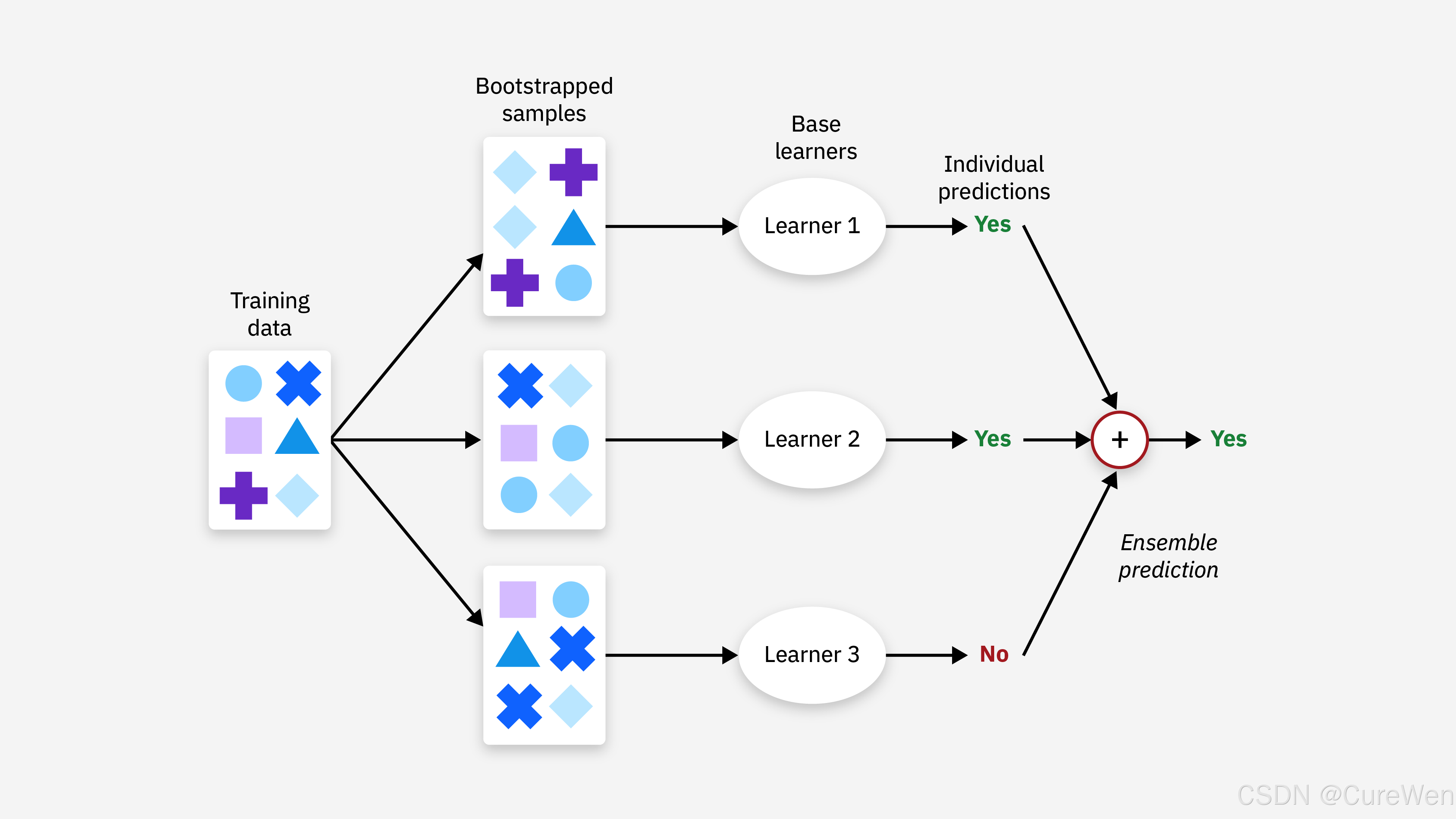 - 简单投票法:少数服从多数(硬投票)或加权投票(软投票)。