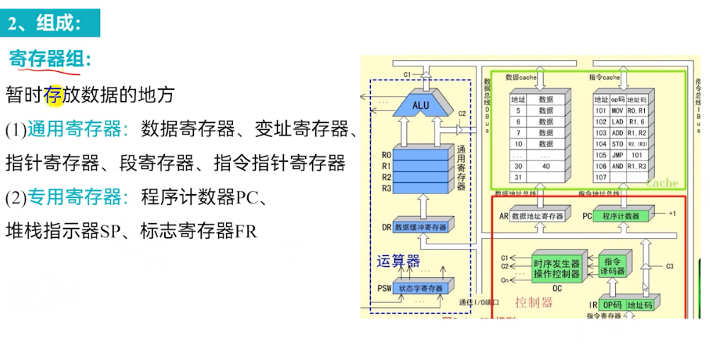 寄存器组是CPU内部的高速存储单元,用于暂时存放数据、地址、指令、状态标志,是CPU与主存之间数据交换的缓冲区。