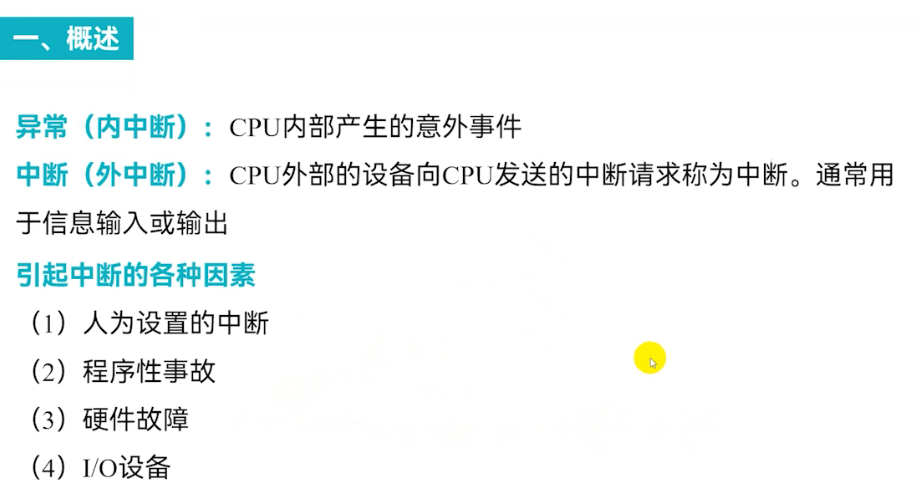 中断 | 外中断 | 外部设备发出请求 | ✅ 可屏蔽 | 键盘输入、定时器到期、磁盘读写完成 |