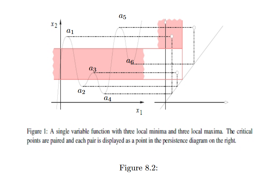 图中,从轴持续上升,从越过和,、结合成对,且,被消灭拉直,以此为例,剩余组合为、和、,Morse函数对应画出持续图,将组合以为轴,以为轴,画点得到持续图。
